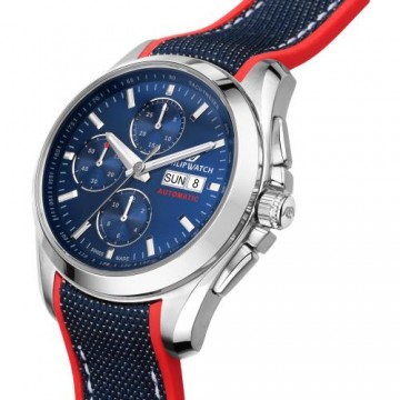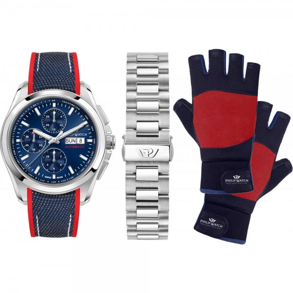 Orologio Philip Watch Amalfi 43 MM Automatico Edizione Limitata. Vetro Zaffiro. Quadrante Blu Sunray. Fondello a Vite e Movimento a Vista. Rotore personalizzato con Monogramma inciso. Bracciale in Silicone e Kevlar. Bracciale addizionale in Acciaio.