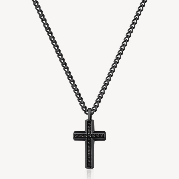 Collana da uomo di Brosway della collezione di Backliner. Gioiello realizzato in acciaio 316L e pvd colore rutenio con pendente a forma di croce, smalto nero e zirconi neri. Lunghezza: 700 mm. La referenza